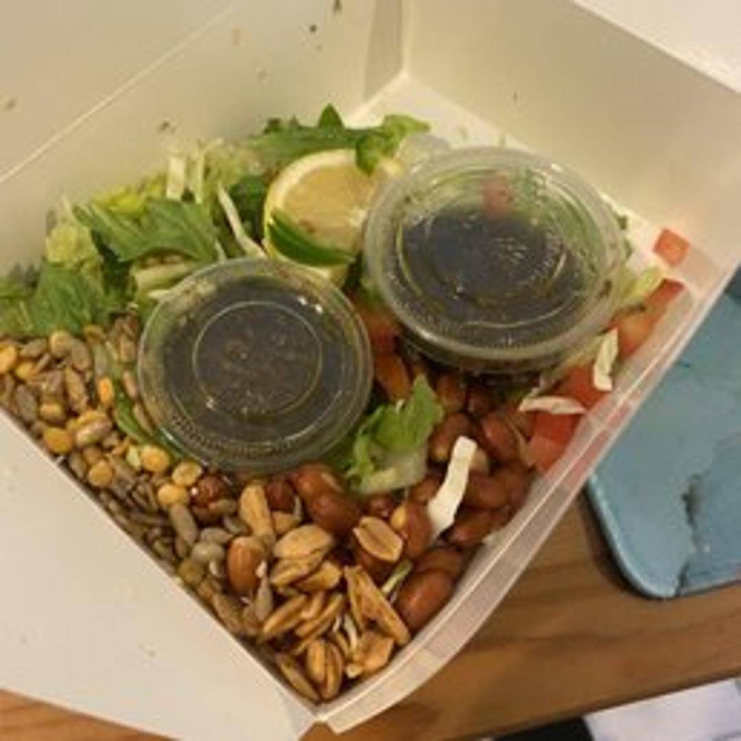 A traditional Burmese salad featuring fermented tea leaves mixed with a variety of crunchy textures and savory flavors. This salad typically includes a combination of ingredients such as fried garlic, roasted peanuts, sesame seeds, sunflower seeds, fried beans, dried shrimp, shredded lettuce, tomatoes, and thinly sliced jalapenos. The fermented tea leaves provide a unique slightly bitter and tangy base, balanced by the other ingredients creating a complex and satisfying dish. It may be served with a lemon wedge for added acidity.