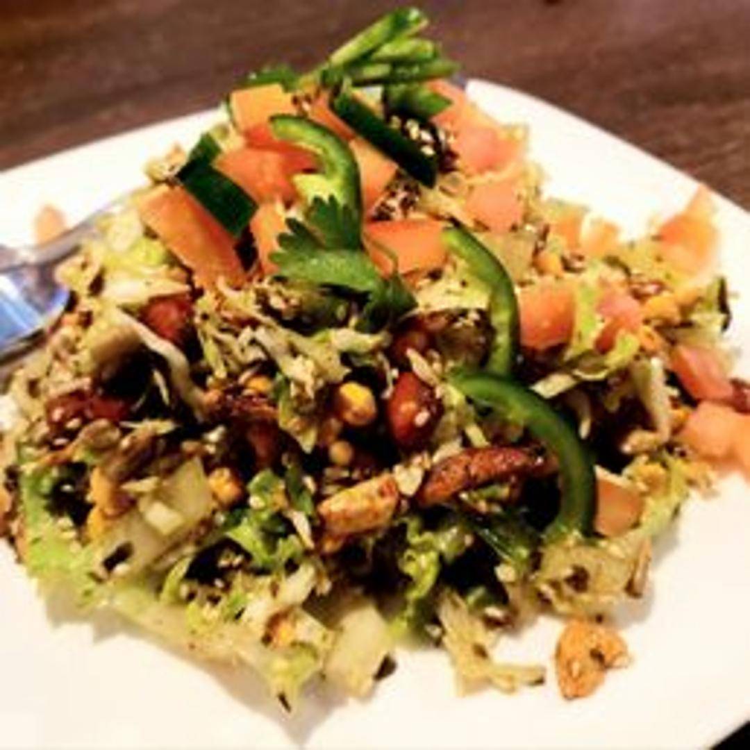 A traditional Burmese salad featuring fermented tea leaves as the star ingredient. This salad boasts a complex blend of textures and flavors, including crispy fried beans, nuts, sesame seeds, tomatoes, and shredded cabbage. Tangy, slightly bitter, and undeniably unique.