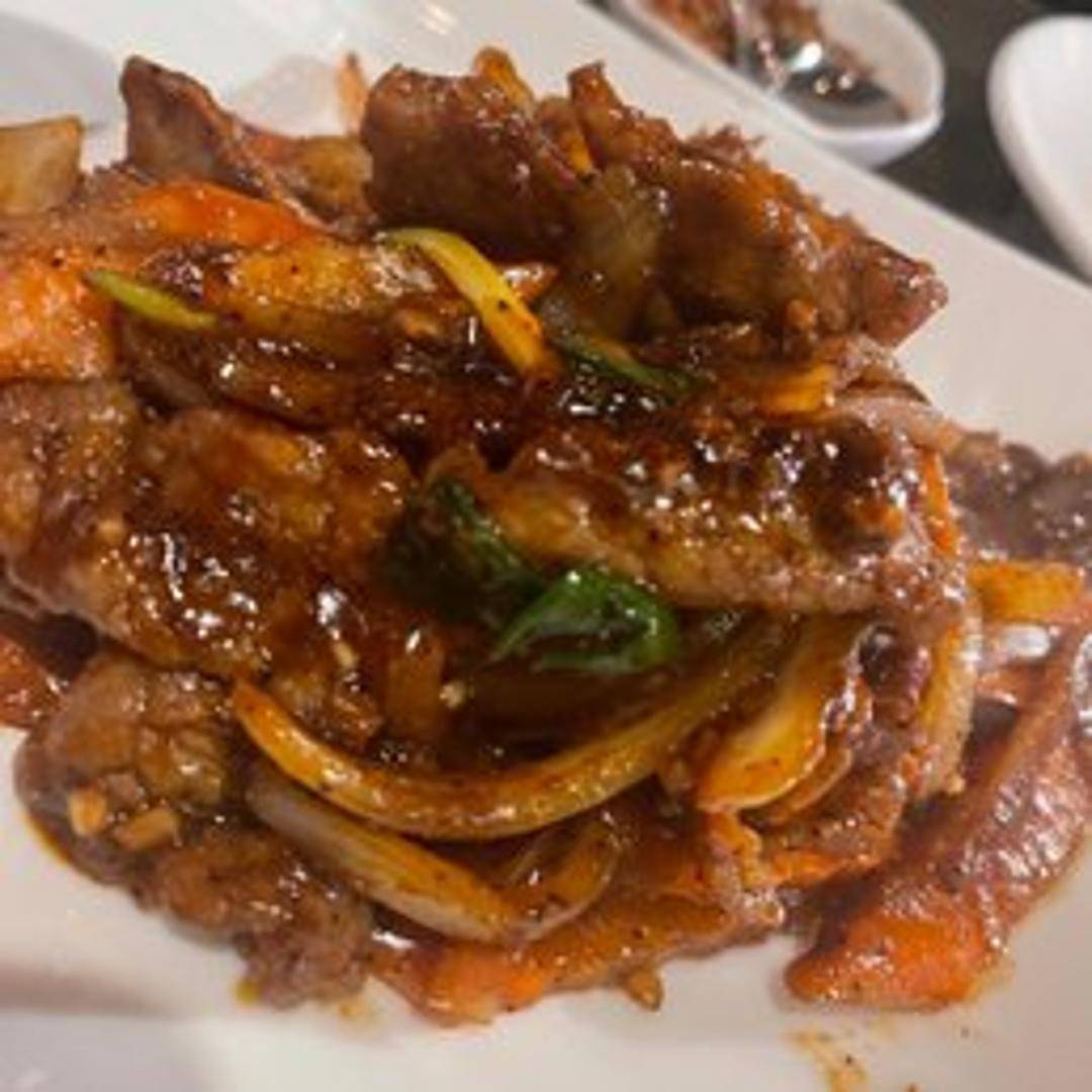 Tender slices of beef stir-fried with bell peppers, onions, and a rich, savory black pepper sauce. Served hot and flavorful.