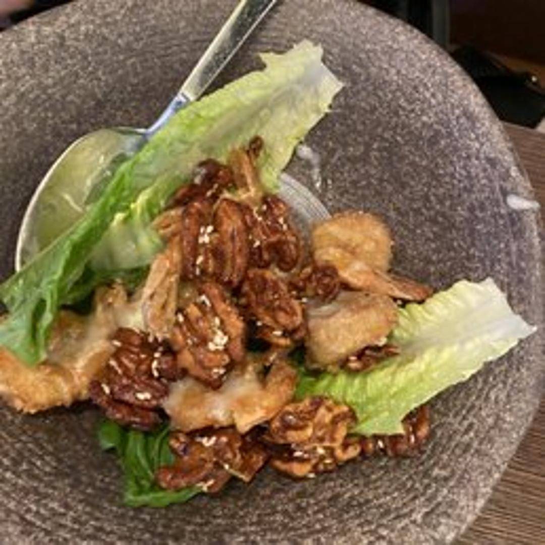 Crispy, succulent shrimp tossed in a creamy honey glaze and sprinkled with candied walnuts. This dish offers a delightful balance of sweet and savory flavors, with a satisfying crunch. Served on a bed of crisp lettuce.