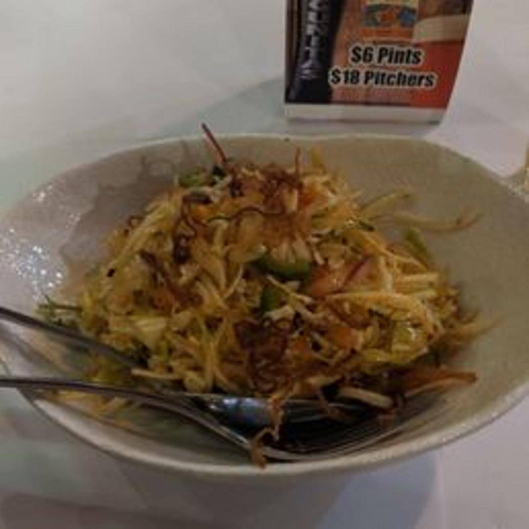 A vibrant and refreshing salad featuring shredded green papaya tossed in a tangy and savory dressing. Often includes ingredients like fish sauce, lime juice, garlic, chili peppers, tomatoes, peanuts, dried shrimp, and long beans, offering a complex balance of sweet, sour, spicy, and umami flavors. The textures are equally appealing, with the crisp papaya contrasting beautifully with the crunchy peanuts and other ingredients.