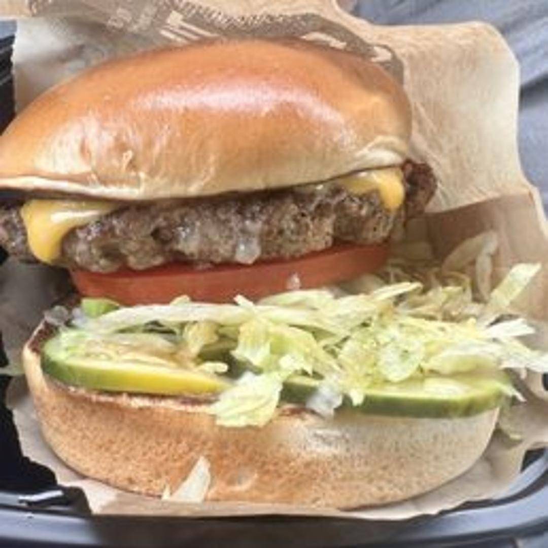 A juicy burger topped with melted cheese, crisp lettuce, ripe tomato, sliced onion, pickles, and a tangy sauce, all served on a toasted bun.
