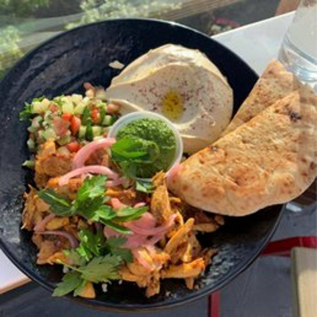 Marinated chicken shawarma served with rice, salad, hummus, and pita bread.