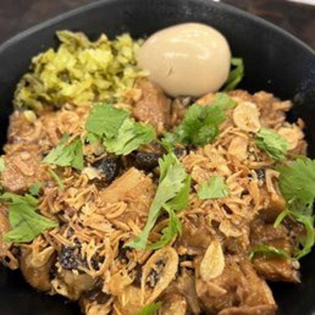 Slow-braised pork belly served over rice with pickled vegetables and a soft-boiled egg.
