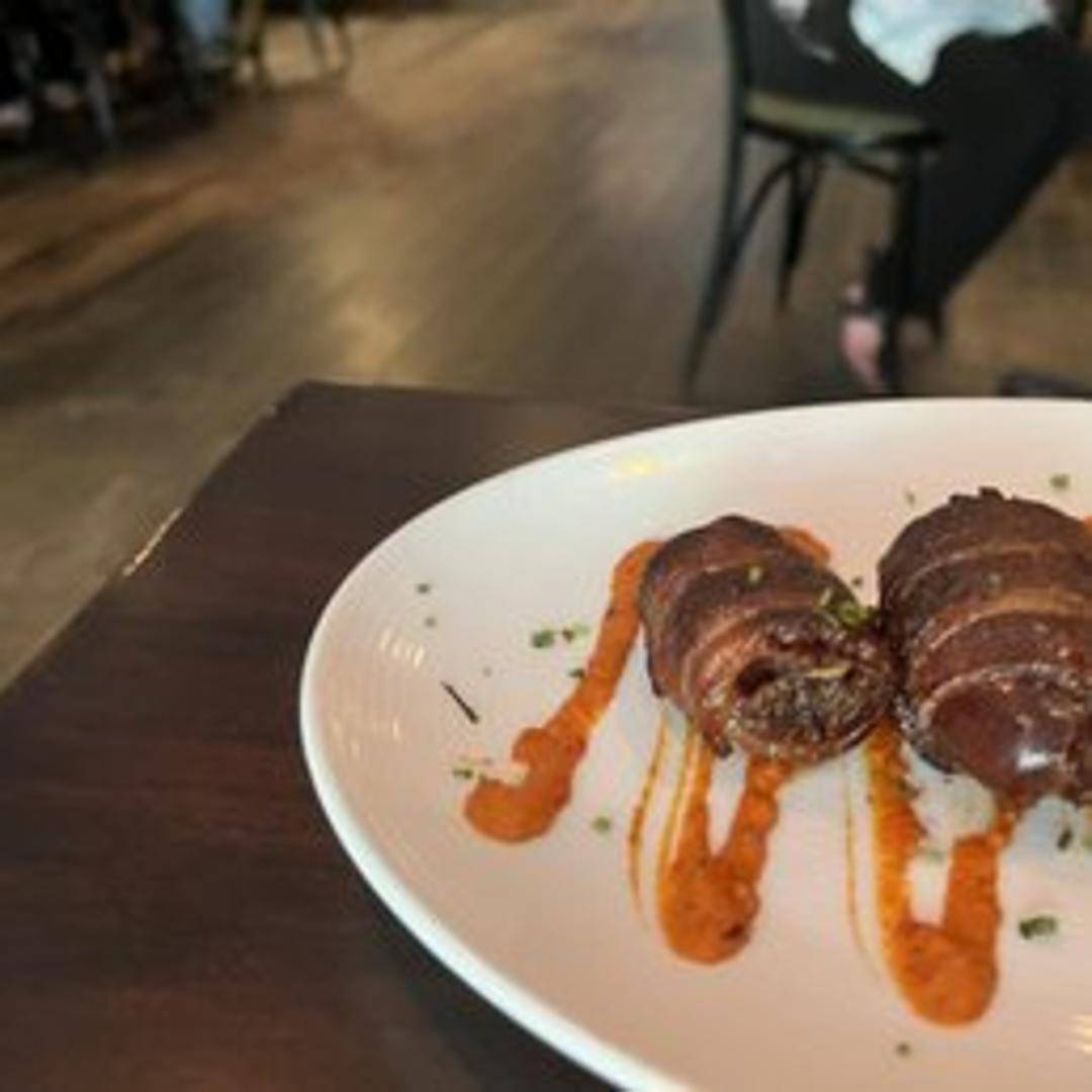 Medjool dates stuffed with cheese, typically Manchego or goat cheese, wrapped in crispy bacon and often drizzled with a balsamic glaze or honey.