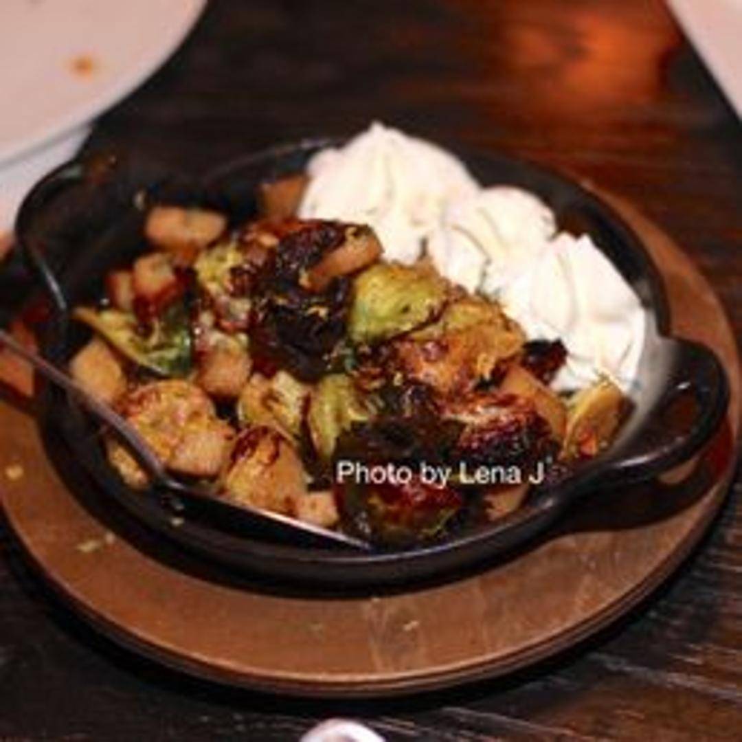 Crispy Brussels sprouts, often tossed with a flavorful sauce featuring ingredients like sherry vinegar, honey, almonds, and smoked paprika.