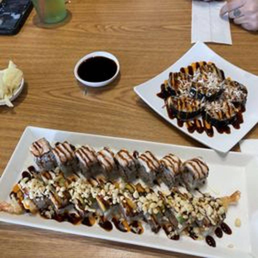 Elaborate sushi roll featuring eel and avocado on top of a California roll base. Often drizzled with eel sauce.
