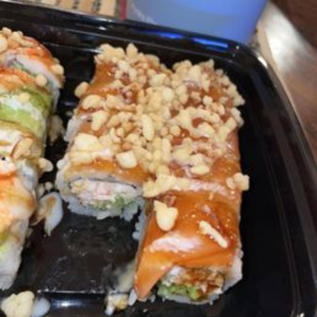 Sushi roll featuring eel and avocado on top, often with a California roll or shrimp tempura base. Drizzled with eel sauce.