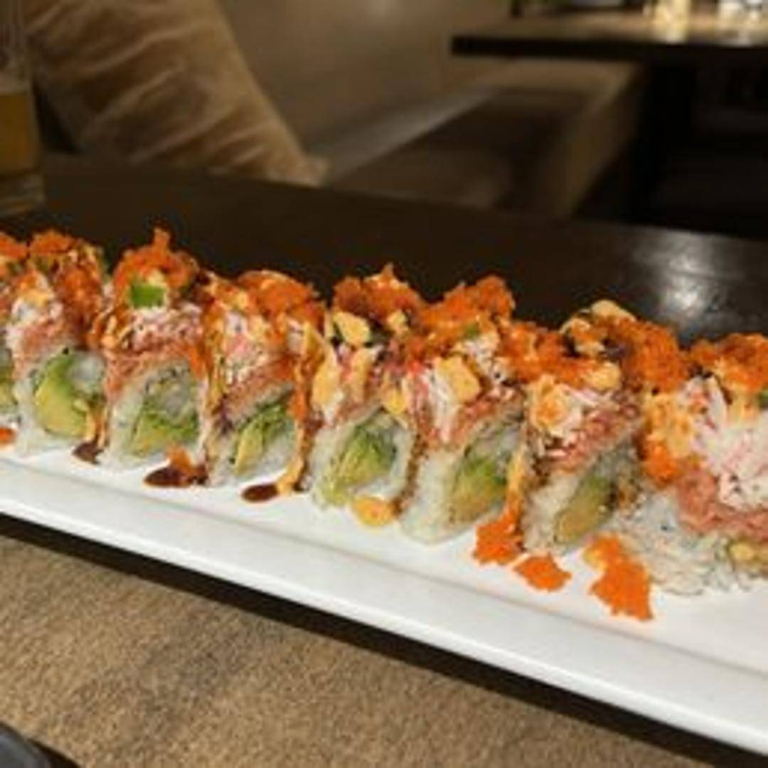 A spicy sushi roll filled with tempura shrimp, avocado, and cucumber, topped with spicy mayo, sriracha, and a sprinkle of sesame seeds. Rolled in crispy tempura flakes for an extra crunch.