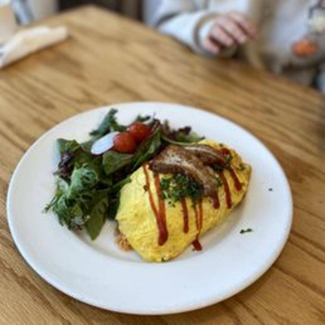 Fluffy Japanese omelet (omurice) filled with flavorful chicken fried rice, topped with slow-braised pork belly (kakuni) in a sweet and savory sauce. Drizzled with [Mention sauce details, e.g., demi-glace, sweet soy sauce].