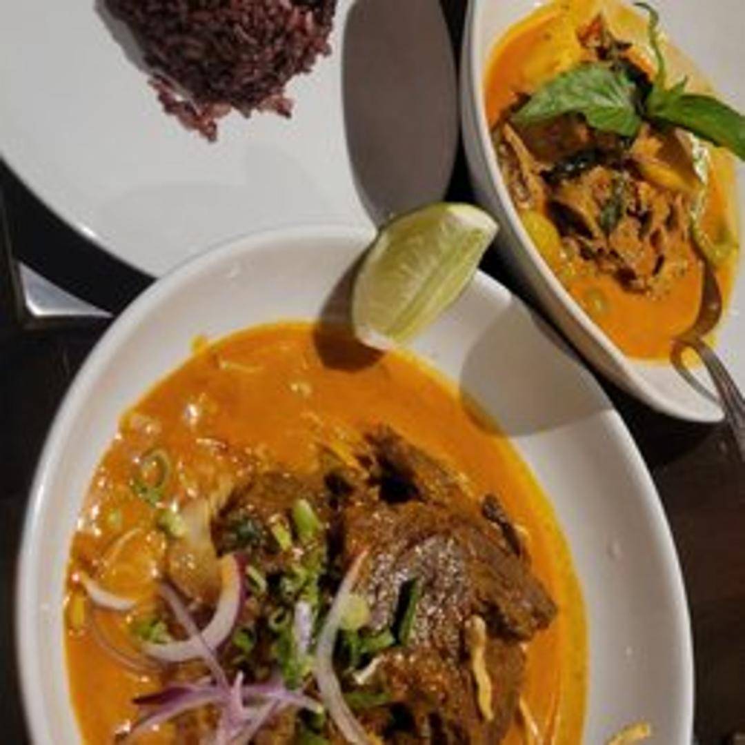 Savor Baan Siam's classic Red Curry (Gaeng Phet), a rich and aromatic staple of Thai cuisine. Made with a fiery blend of red chilies, galangal, lemongrass, and kaffir lime, this creamy curry is simmered with coconut milk and traditional vegetables, offering a spicy yet balanced flavor profile that is deeply satisfying and pairs perfectly with jasmine rice.