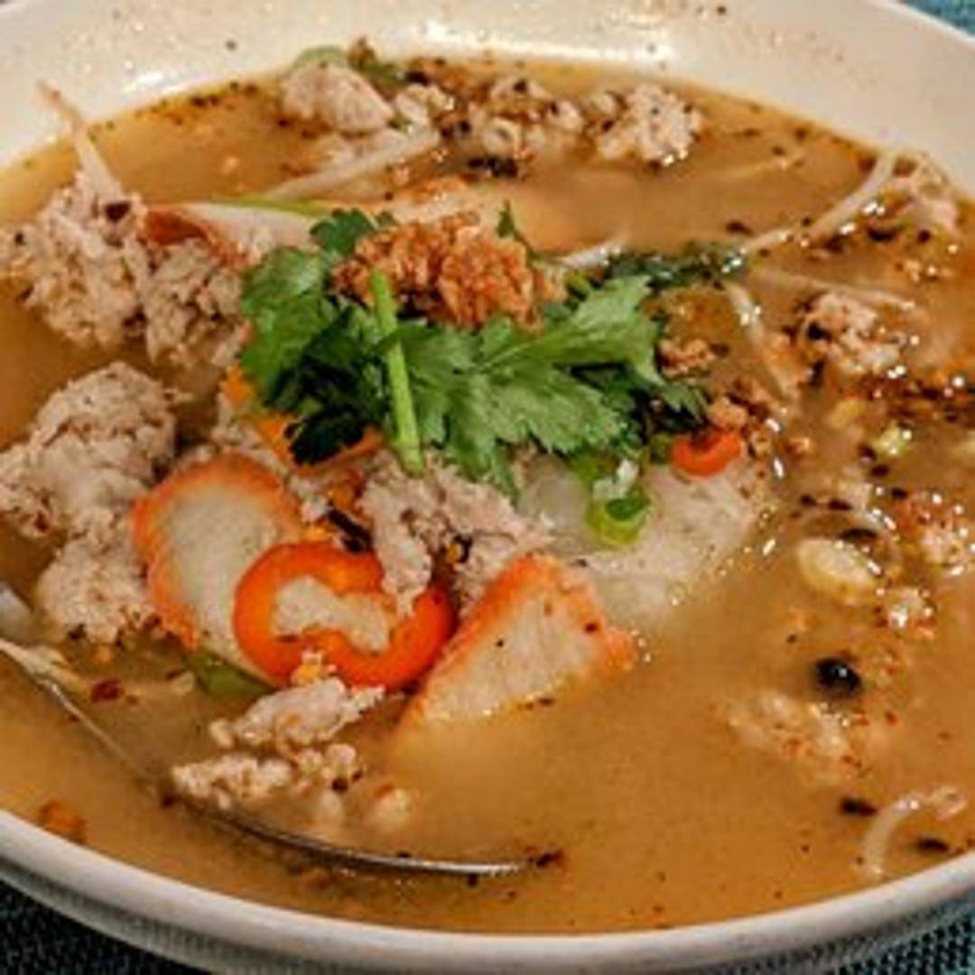 A classic and aromatic Thai hot and sour soup, infused with fragrant lemongrass, galangal, kaffir lime leaves, and lime juice. This comforting rendition features your choice of protein and delicate rice noodles, creating a hearty and flavorful meal, typically garnished with fresh herbs and mushrooms.