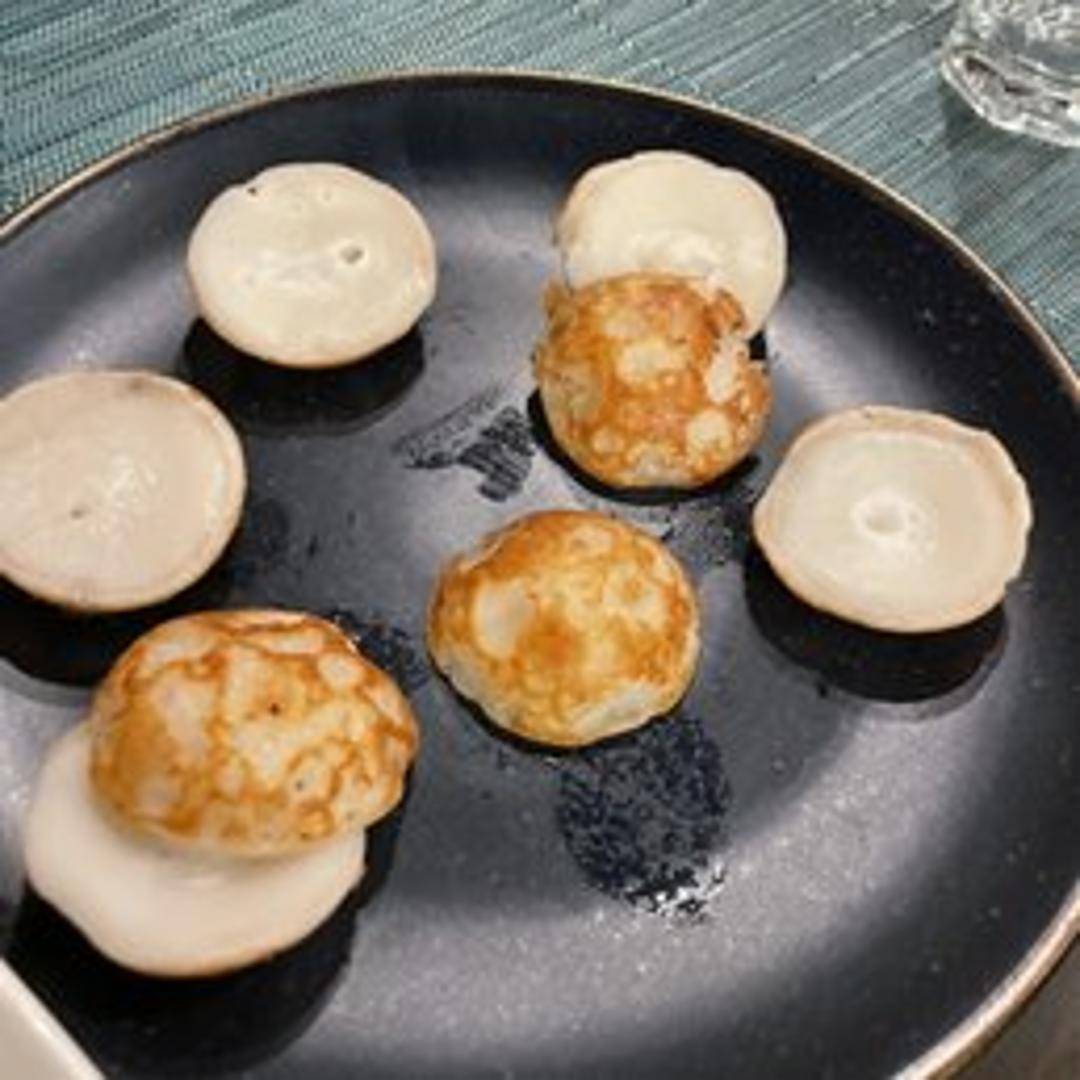 Indulge in our delightful Coconut Griddle Cakes, a beloved Thai dessert. These small, golden-brown pancakes are crafted from a sweet batter of coconut milk and rice flour, cooked to achieve perfectly crispy edges and a wonderfully soft, creamy center. Served warm, they offer a comforting and authentic taste of Thailand's culinary traditions.