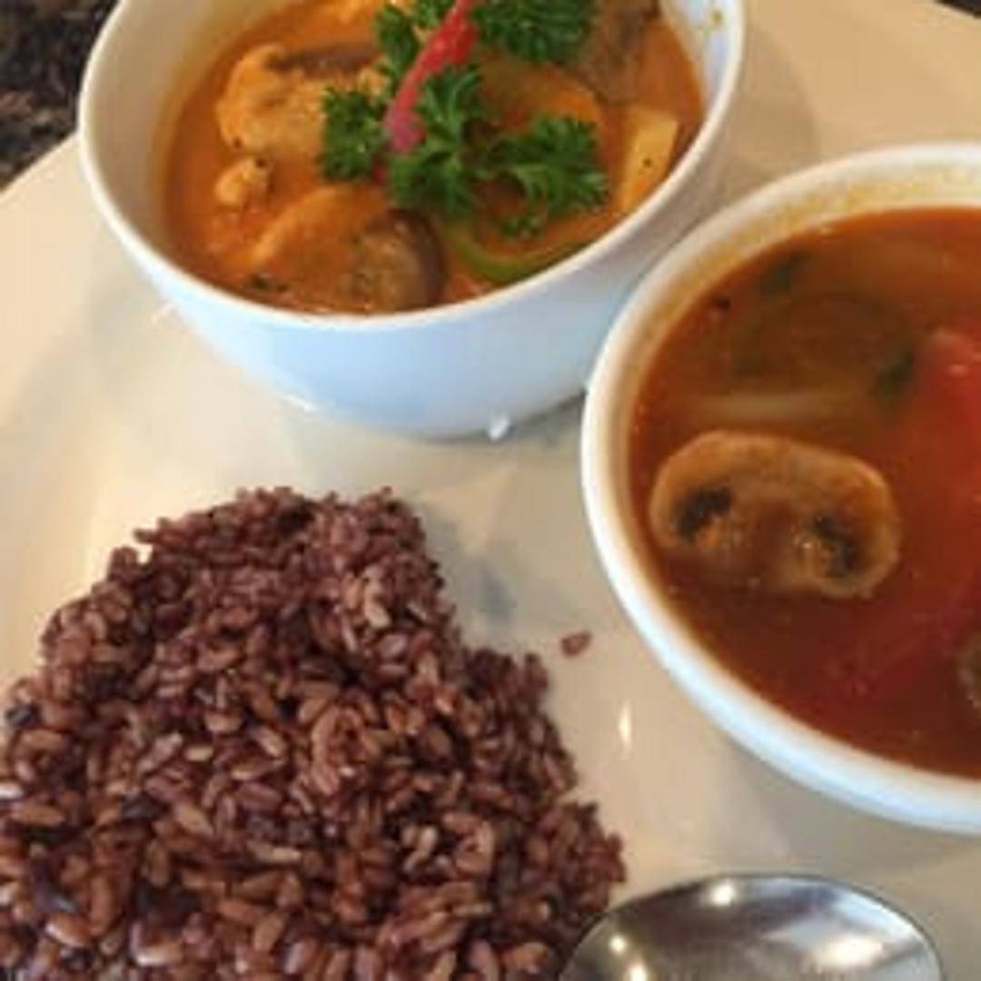 A flavorful Thai curry cooked in red curry paste, coconut milk, bamboo shoots, bell peppers, basil leaves, and your choice of protein (chicken, beef, pork, tofu, or shrimp). Served with steamed jasmine rice.