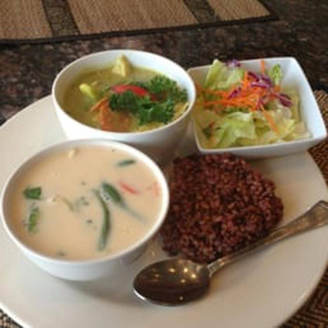 A fragrant and creamy coconut milk soup with galangal, lemongrass, kaffir lime leaves, mushrooms, tomatoes, and your choice of protein (chicken or tofu). Garnished with cilantro and chili oil.