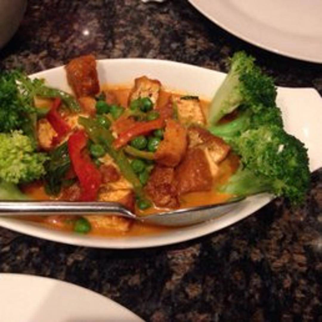 A rich and creamy red curry with your choice of protein (tofu, chicken, pork, beef, or shrimp), coconut milk, bell peppers, green beans, and basil leaves. Served with steamed jasmine rice.