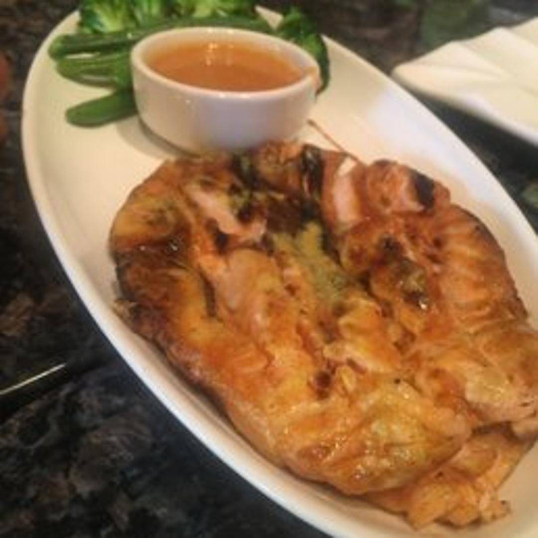 Grilled skewers of marinated salmon, seasoned with Thai spices and served with a creamy peanut sauce. Garnished with cucumber relish.