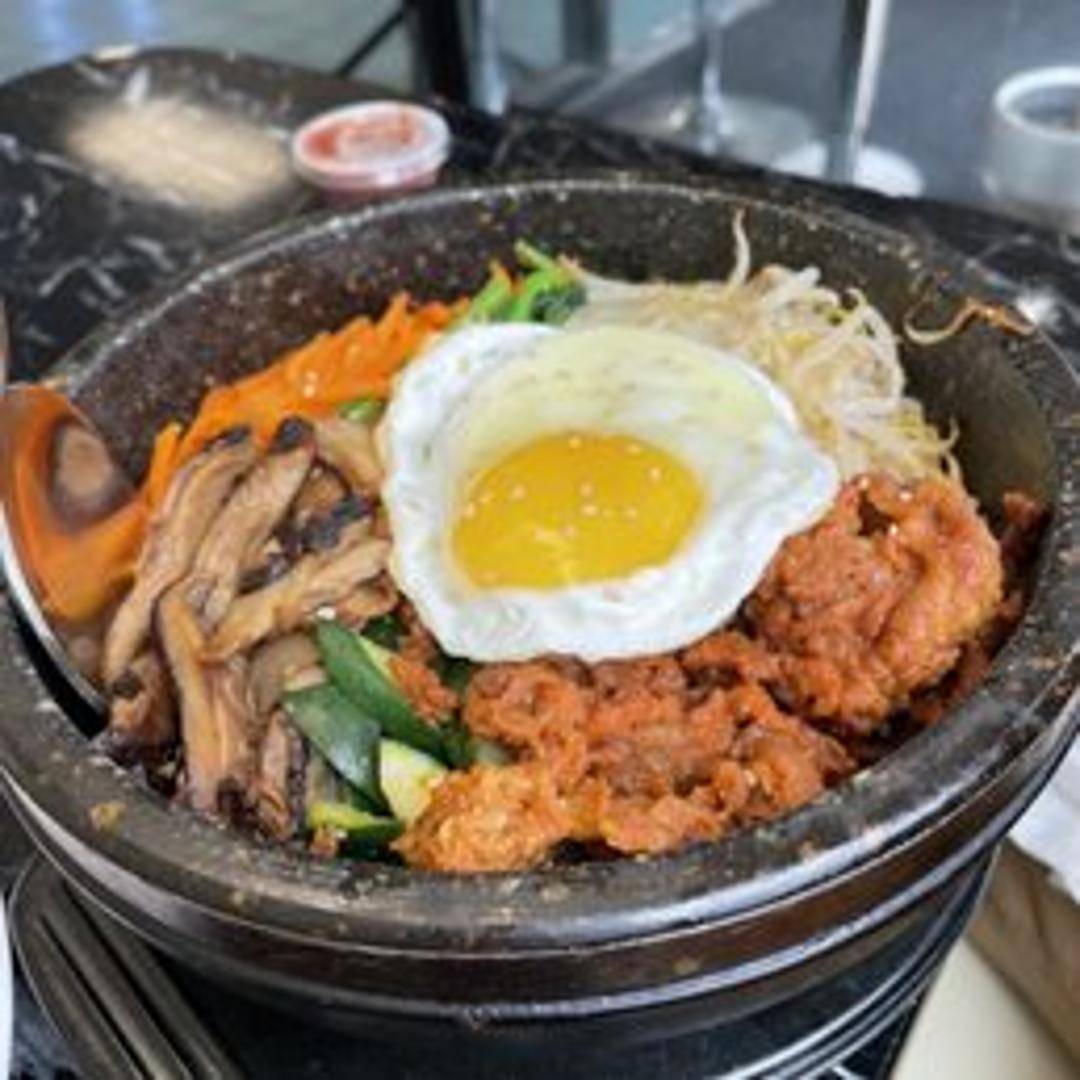 A sizzling stone bowl filled with rice, marinated spicy pork, assorted sautéed vegetables (such as carrots, zucchini, spinach, and bean sprouts), and a fried egg. Served with a side of gochujang (Korean chili paste) to mix in to your desired spice level. The hot stone bowl creates a crispy layer of rice at the bottom.