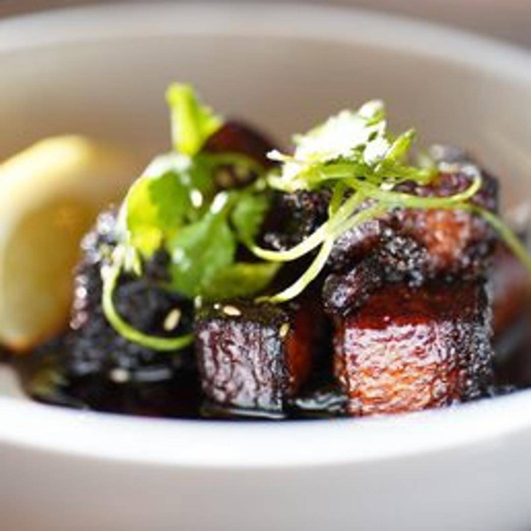 Slow-cooked pork belly, glazed with a sweet and savory sauce. Served with crispy polenta and pickled vegetables. Finished with toasted sesame seeds.