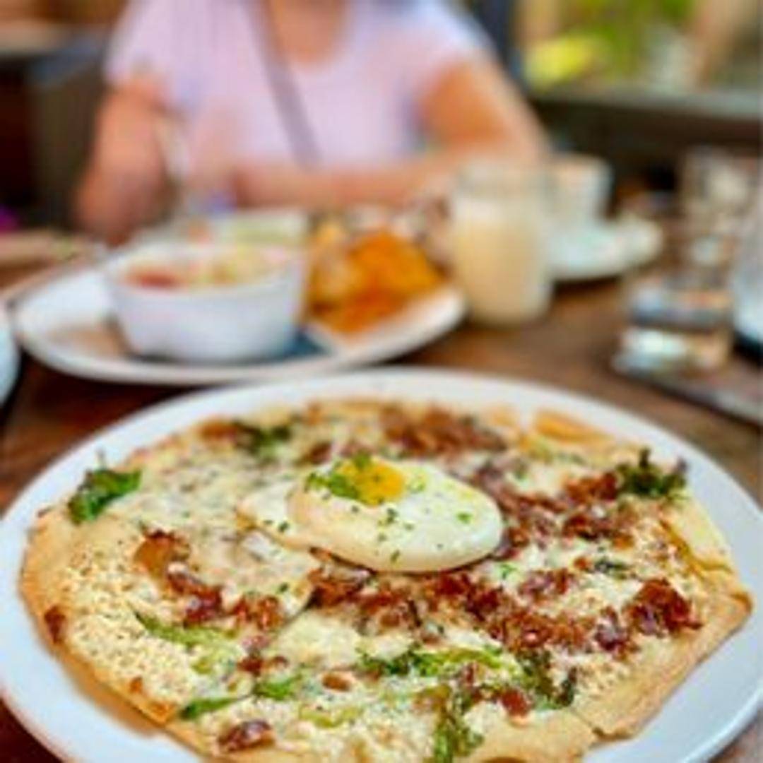 A thin-crust pizza topped with a blend of cheeses, your choice of toppings, and a perfectly cooked egg in the center. A delightful combination of breakfast and pizza.