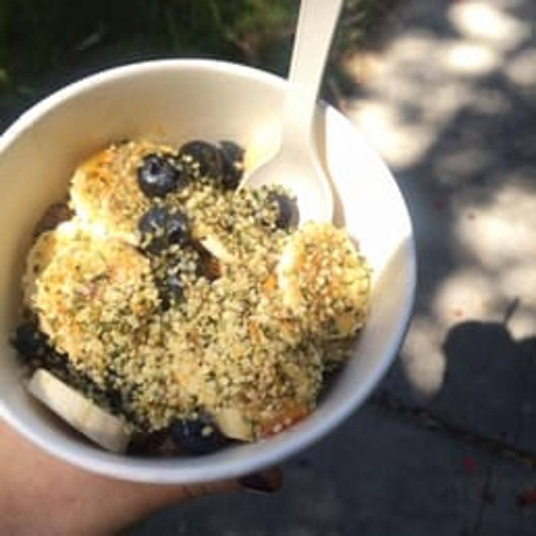 Açaí blended with banana, protein powder, and almond milk, topped with granola, banana, almond butter, hemp seeds, cacao nibs, and honey.