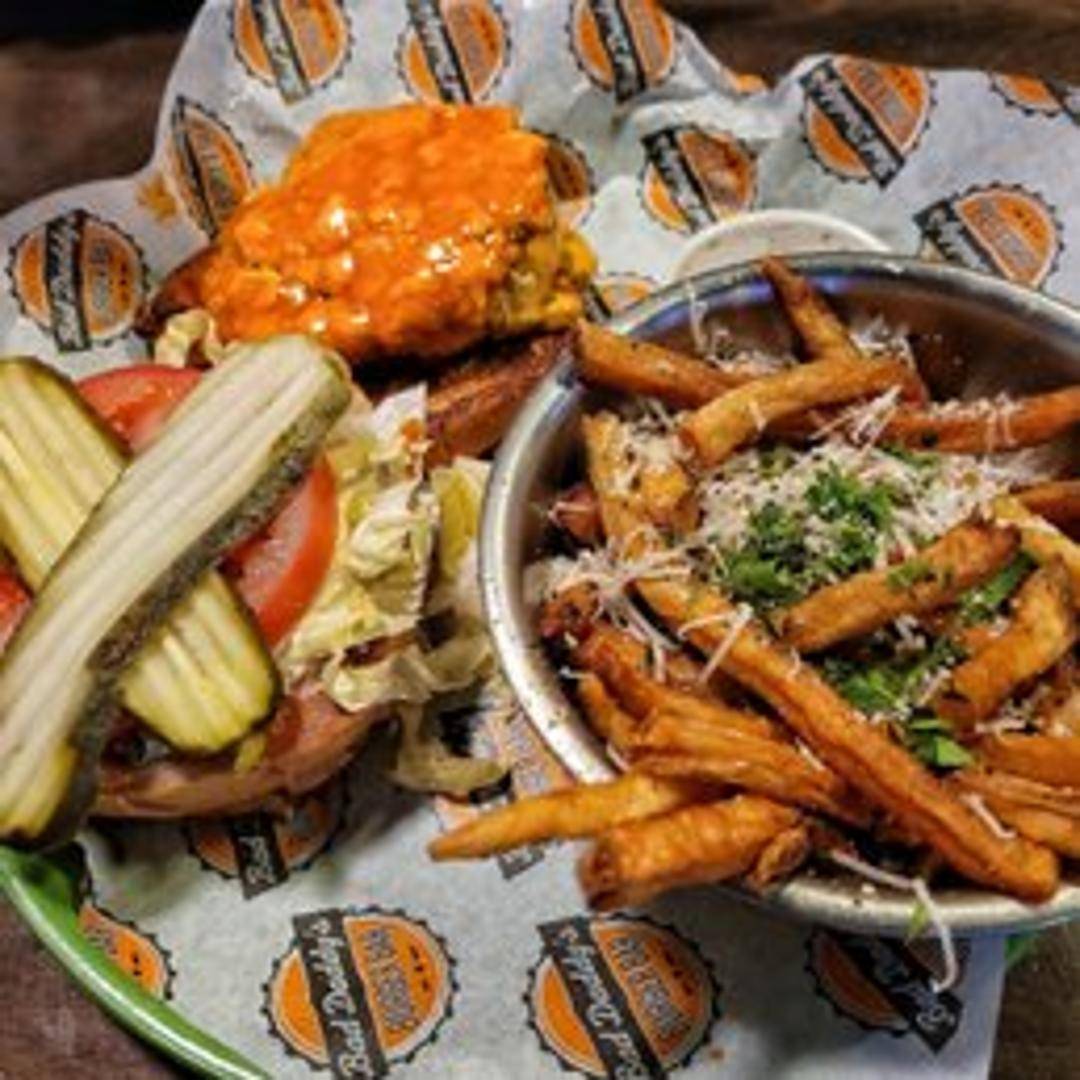 Crispy or grilled chicken breast tossed in buffalo sauce, topped with lettuce, tomato, and your choice of ranch or bleu cheese dressing, served on a toasted bun.
