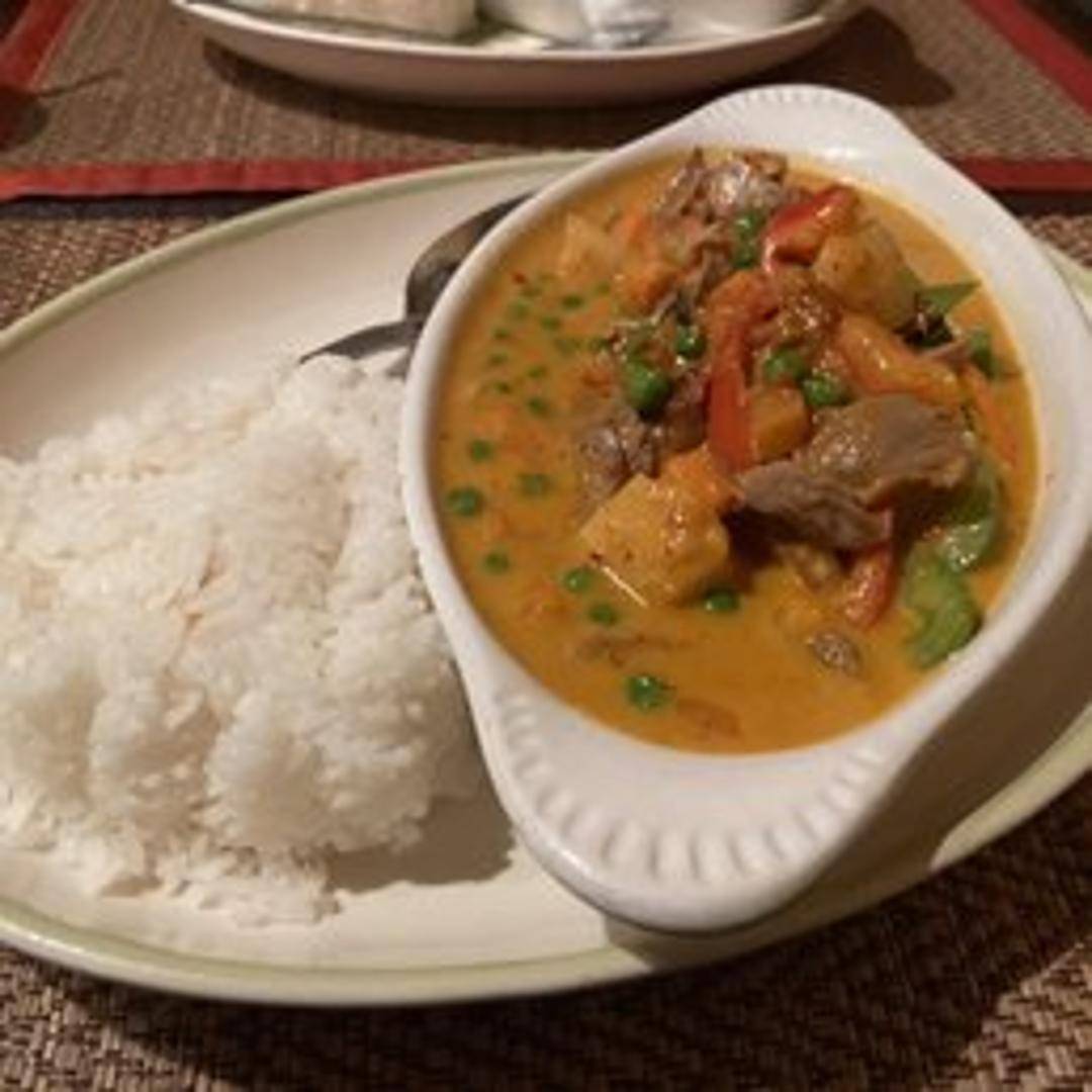 Tender roasted duck simmered in a red curry sauce with coconut milk, pineapple, tomatoes, bell peppers, and basil leaves. Rich and flavorful.