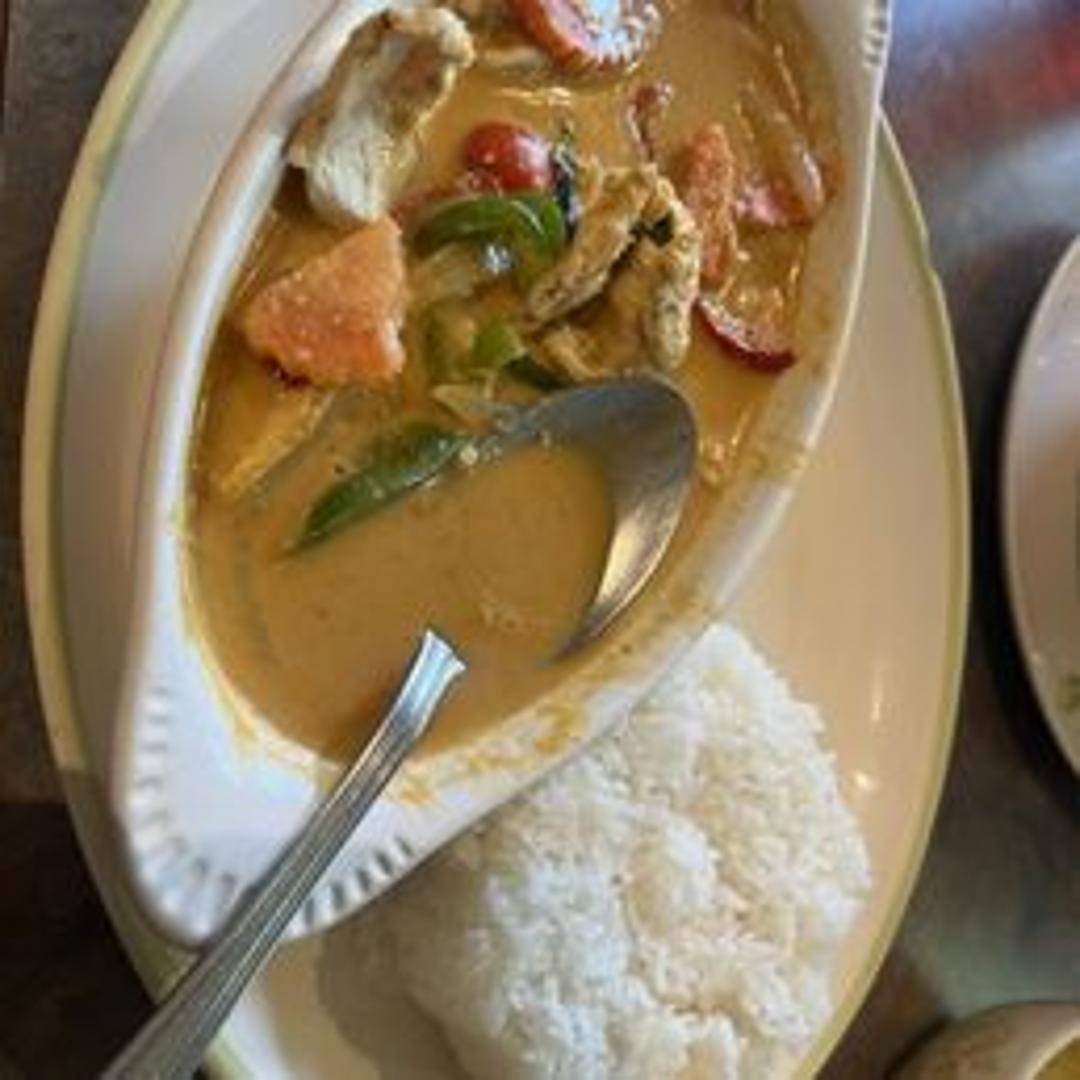 A rich and creamy curry with a slightly sweet and nutty flavor, cooked in coconut milk with bell peppers and basil. Served with steamed rice.