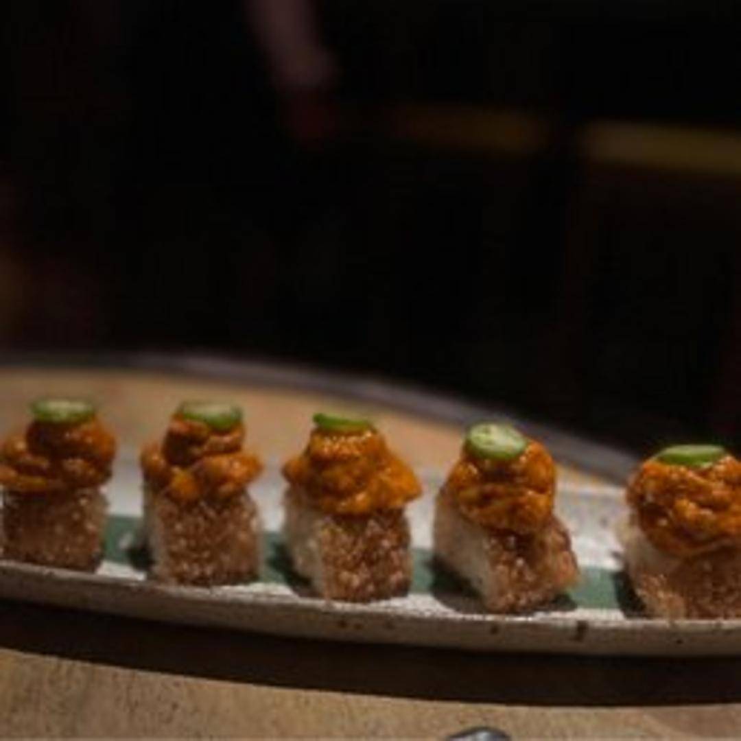 A playful yet sophisticated fusion of textures and flavors. Finely diced Hamachi (yellowtail) is tossed in a vibrant, savory spicy sauce, then artfully presented atop a perfectly crisp and airy rice base, creating a delightful textural contrast and a memorable culinary experience.
