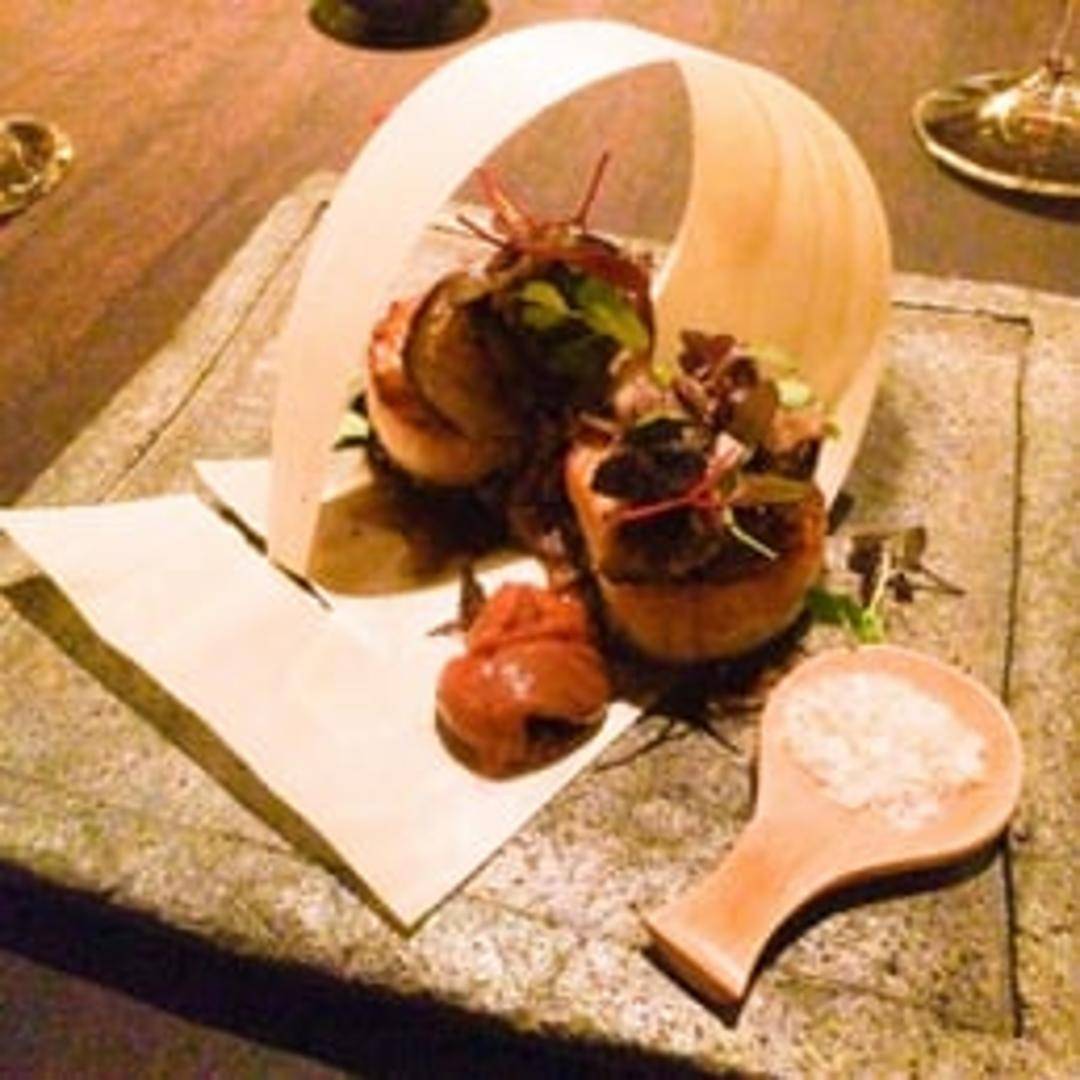 An exquisite appetizer pairing perfectly seared, plump sea scallops with rich, buttery foie gras, creating a harmonious blend of delicate seafood and luxurious poultry, typically served with a complementary reduction or a subtly sweet sauce to enhance its opulent flavors.
