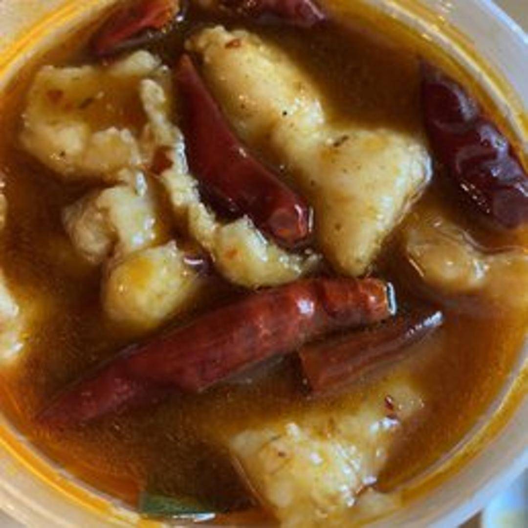 Lightly battered and fried fish fillets tossed in a fiery Kung Fu sauce with a medley of vegetables, including bell peppers, onions, and chili peppers. Garnished with sesame seeds.