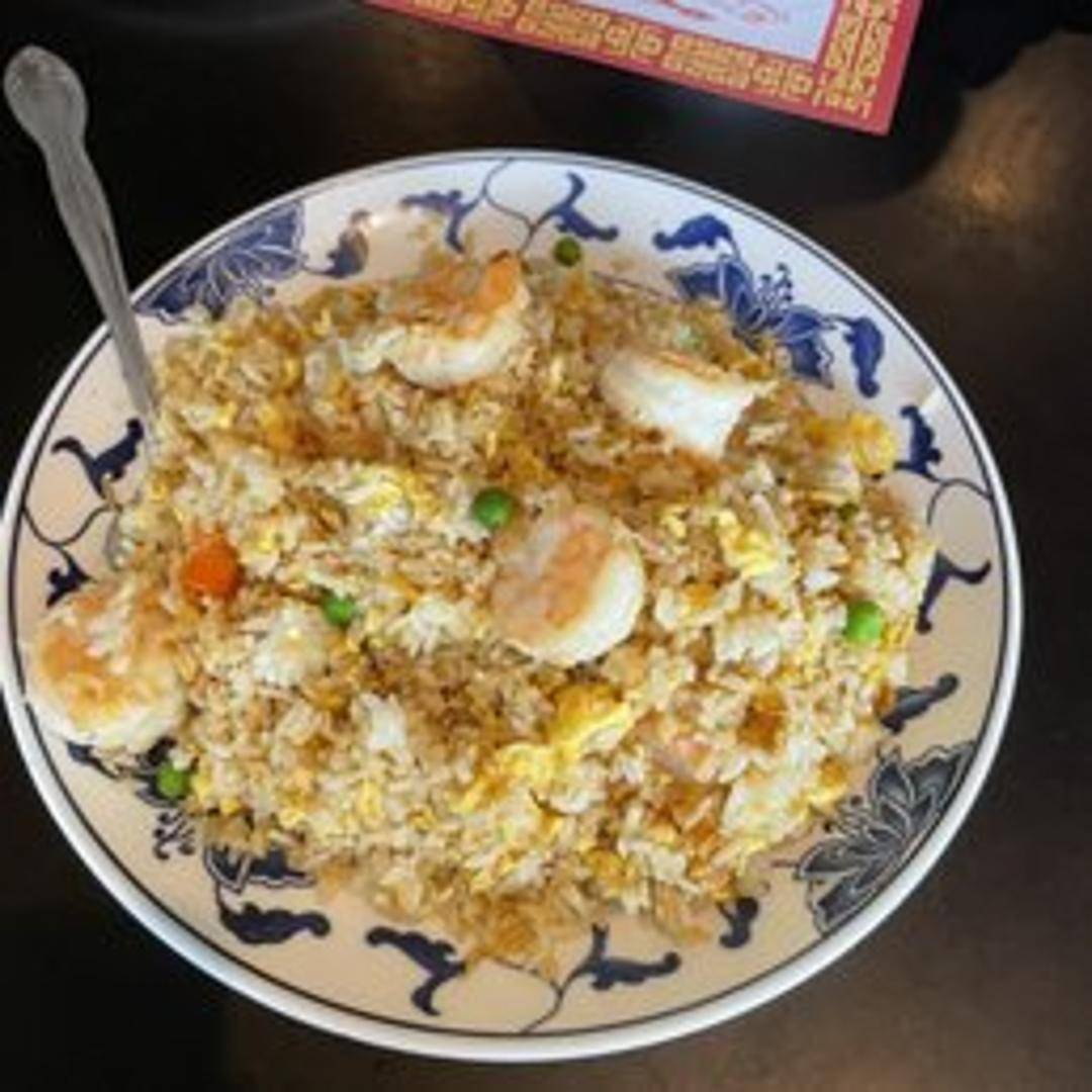 Classic fried rice dish featuring succulent shrimp, fluffy rice, scrambled egg, diced carrots, peas, and onions, all stir-fried in a savory blend of soy sauce and seasonings.