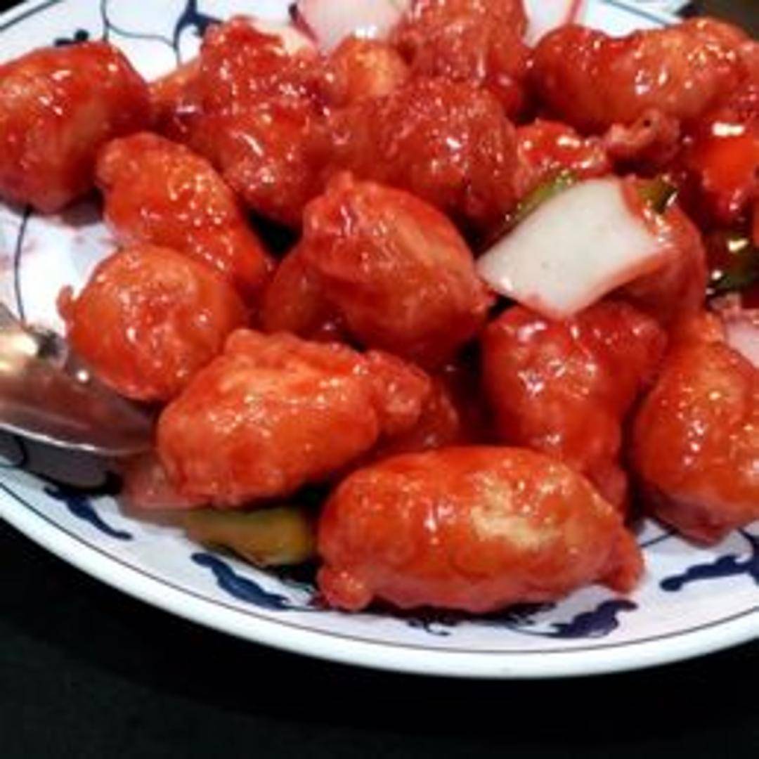 Crispy, battered chicken pieces coated in a tangy and sweet sauce. The sauce typically contains sugar, vinegar, ketchup, and soy sauce. Often includes pineapple chunks, bell peppers, and onions.