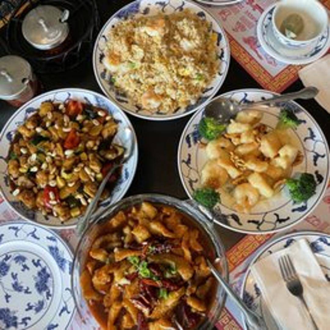 Diced chicken stir-fried with peanuts, vegetables (typically bell peppers, onions, and celery), and chili peppers in a spicy and savory Kung Pao sauce. Garnished with dried chili peppers for an extra kick.