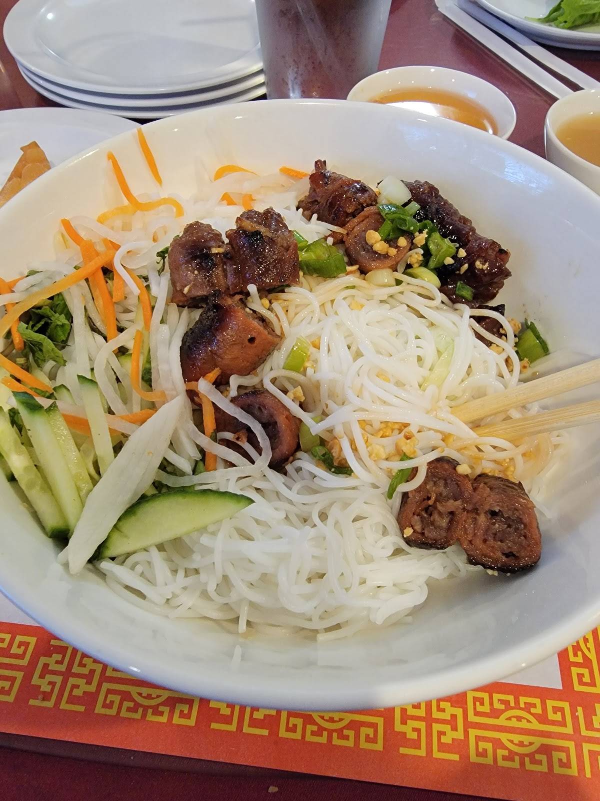 A refreshing and vibrant Vietnamese classic featuring delicate rice vermicelli noodles nestled over a bed of crisp shredded lettuce, cucumbers, and bean sprouts. Topped with your choice of savory grilled meat or crispy imperial rolls, fresh herbs, crushed peanuts, and served with a side of our house-made Nuoc Cham fish sauce for a perfect balance of sweet, savory, and tangy flavors.