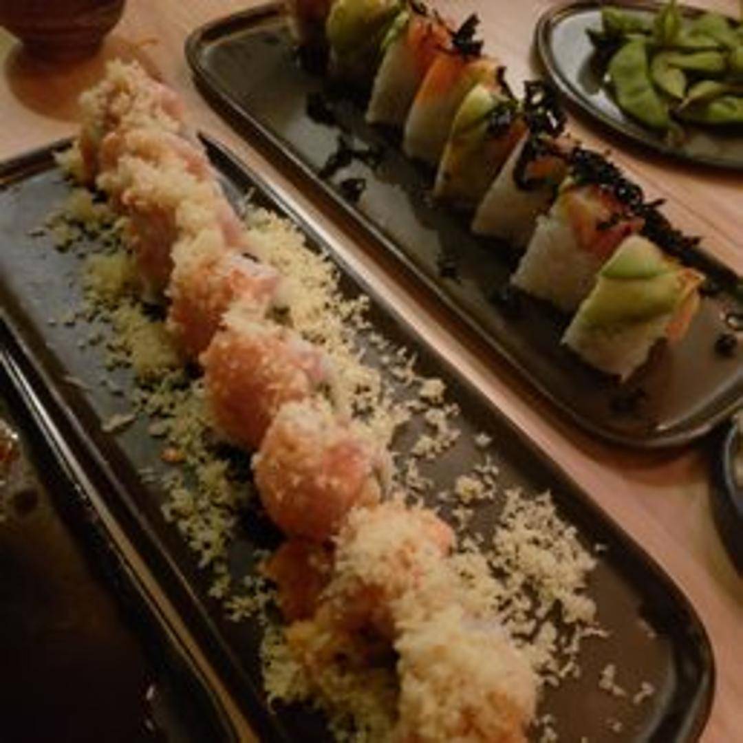 A sushi roll featuring a blend of ingredients. Specific ingredients vary but usually include avocado, cucumber, and a protein, wrapped in seaweed and rice, then topped with a unique sauce and garnish.