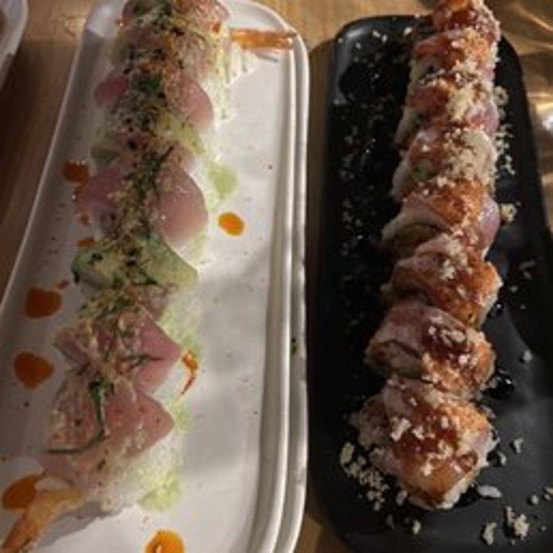 A visually stunning sushi roll often featuring a vibrant color palette and unique presentation. Common ingredients include crab, avocado, and cucumber, often topped with salmon and a special sauce.