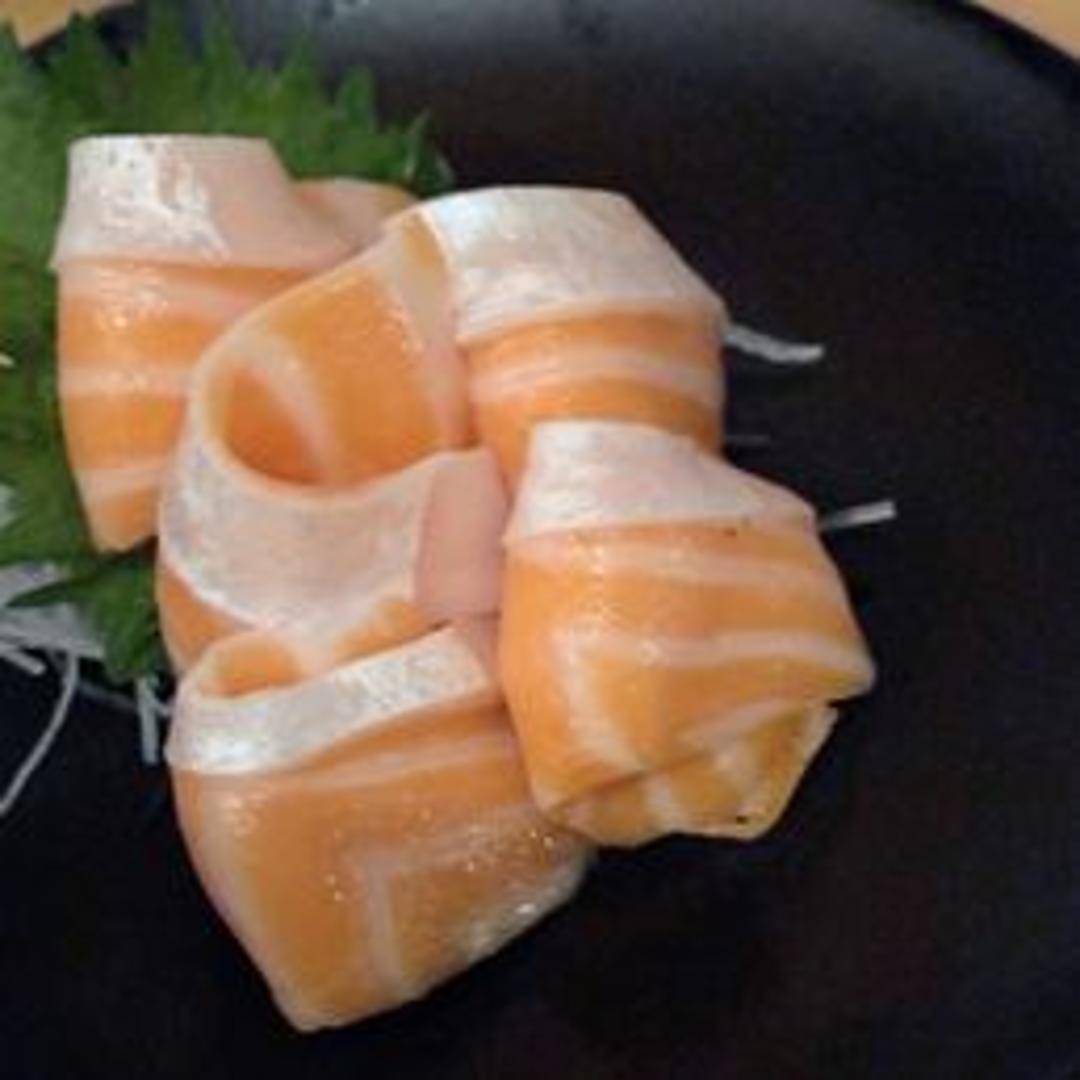 Thinly sliced, fresh, raw salmon. Delicate texture and rich, buttery flavor. Served with soy sauce and wasabi.