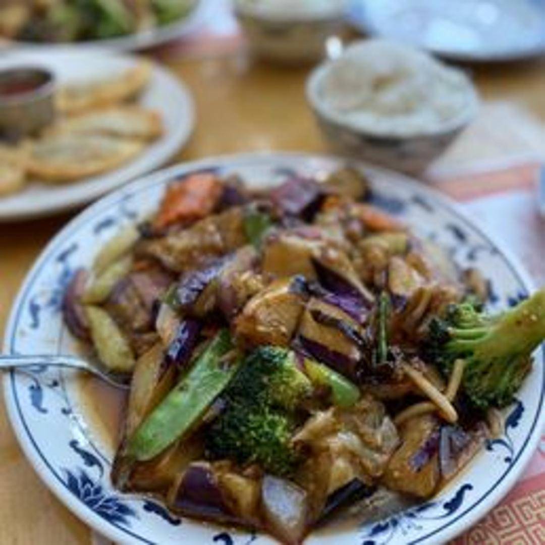 Tender slices of eggplant wok-fried and coated in a vibrant, aromatic garlic sauce, served as a satisfying and flavorful lunch portion.