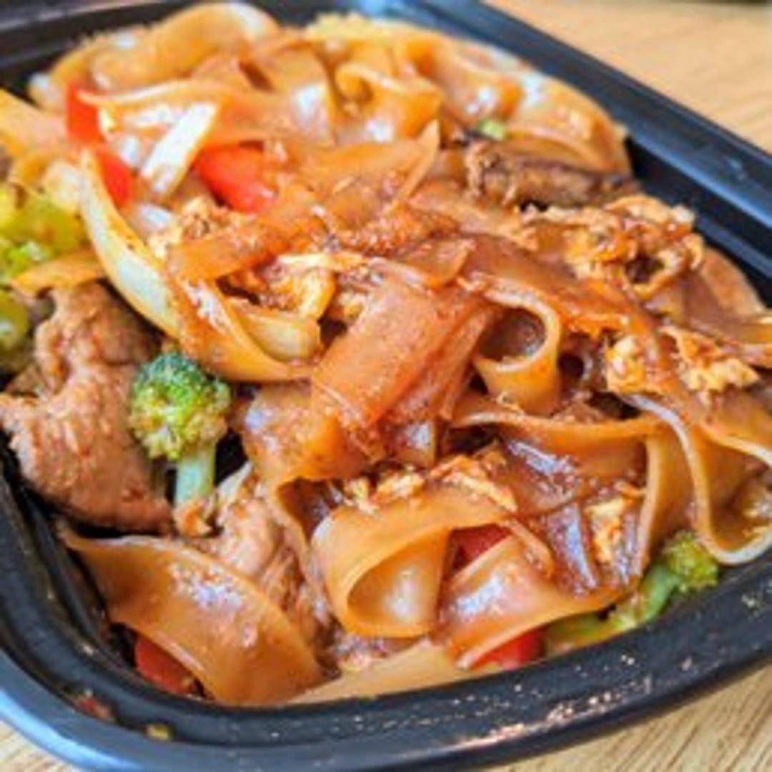 Also known as 'Drunken Noodles,' this popular Thai stir-fried dish features wide rice noodles tossed with fresh chili, garlic, green peppercorns, kaffir lime leaves, holy basil, and a savory sauce. It's renowned for its spicy kick and aromatic, savory profile.