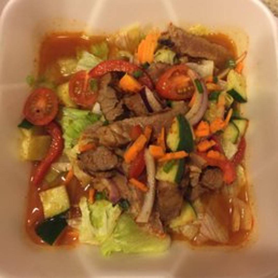 A refreshing and zesty Thai-style salad featuring tender slices of grilled beef tossed with fresh herbs like mint and cilantro, crisp red onions, cucumber, and ripe tomatoes. Drizzled with a tangy lime-based dressing that offers a delightful balance of spicy, sour, and savory flavors, making for a light yet satisfying dish.