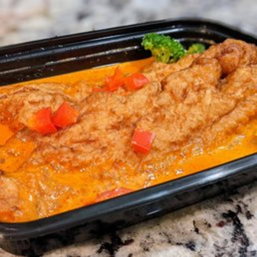 A delectable Thai curry dish featuring succulent fish, pan-seared or lightly fried, bathed in a rich and aromatic Choo Chee red curry sauce. This creamy and flavorful sauce is made with red curry paste, coconut milk, kaffir lime leaves, and a touch of sweetness, delivering a harmonious blend of savory and mildly spicy notes that perfectly complements the delicate fish.