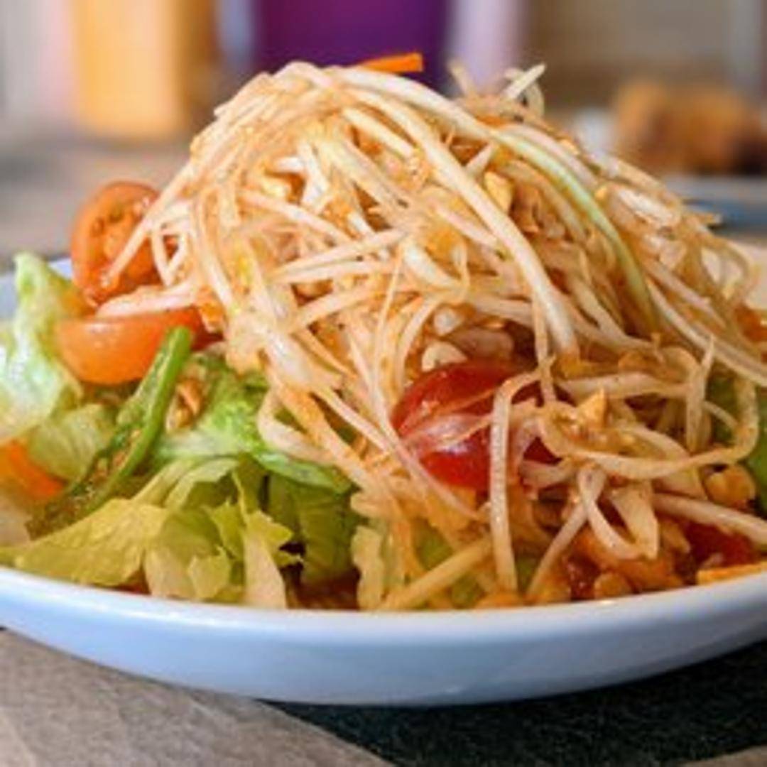 A refreshing and spicy Thai salad (Som Tum) made from shredded green (unripe) papaya, pounded together with long beans, tomatoes, peanuts, garlic, fresh chilies, lime juice, fish sauce, and palm sugar. It delivers a lively combination of spicy, sour, sweet, and salty flavors.