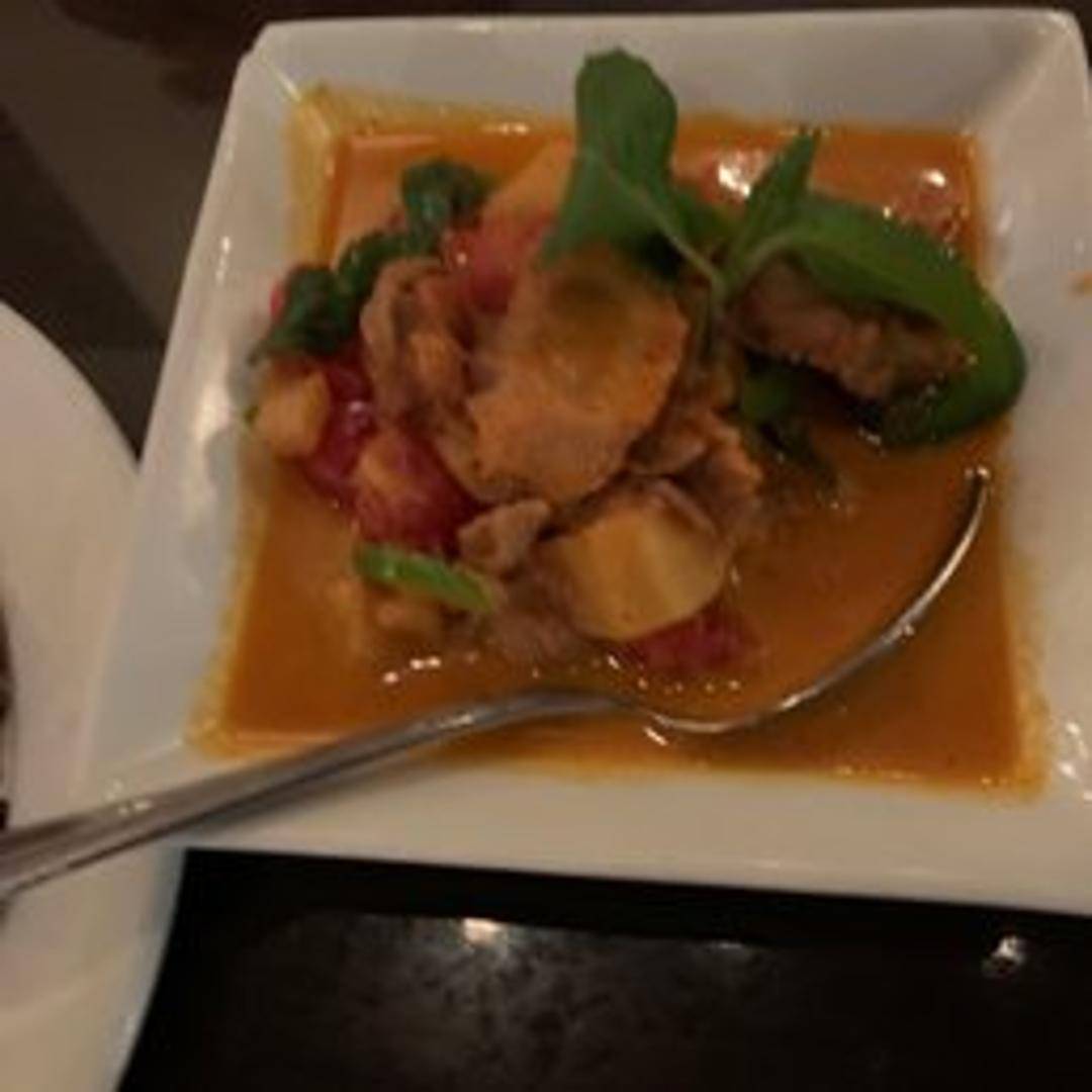 Indulge in succulent slices of crispy roast duck, simmered in a rich and aromatic red curry paste blended with creamy coconut milk. This classic Thai curry is elevated with the addition of juicy pineapple chunks, sweet cherry tomatoes, and fragrant Kaffir lime leaves and basil, offering a delightful balance of sweet, savory, and spicy notes.