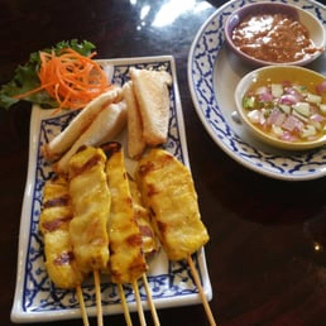 Succulent pieces of chicken breast, marinated in a flavorful blend of turmeric and spices, then perfectly grilled on skewers until golden brown. Served with our rich and creamy homemade peanut sauce, offering a delightful balance of savory and sweet notes, and a refreshing cucumber relish.