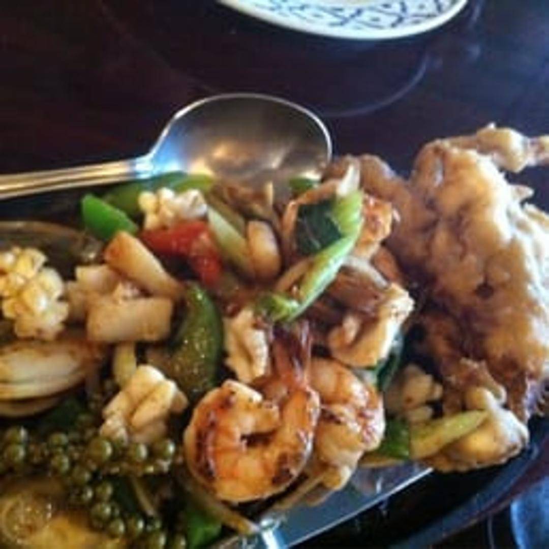 An exhilarating culinary journey to the sea, this vibrant dish combines a medley of fresh seafood—shrimp, calamari, scallops, and mussels—stir-fried with crisp bell peppers, onions, and aromatic basil in a fiery, savory chili paste. The 'Talay' delivers a robust, spicy kick balanced by the freshness of the ocean's bounty.