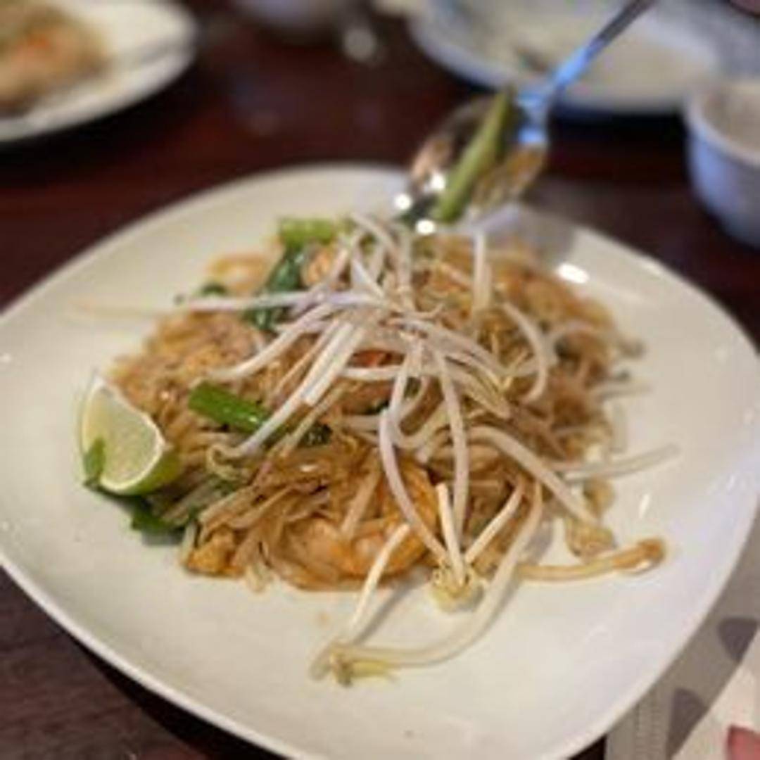 A classic and beloved Thai stir-fried noodle dish featuring thin rice noodles, a sweet and savory tamarind-based sauce, scrambled egg, bean sprouts, and green onions. Traditionally garnished with crushed peanuts and a lime wedge, offering a perfect balance of sweet, sour, and savory flavors.