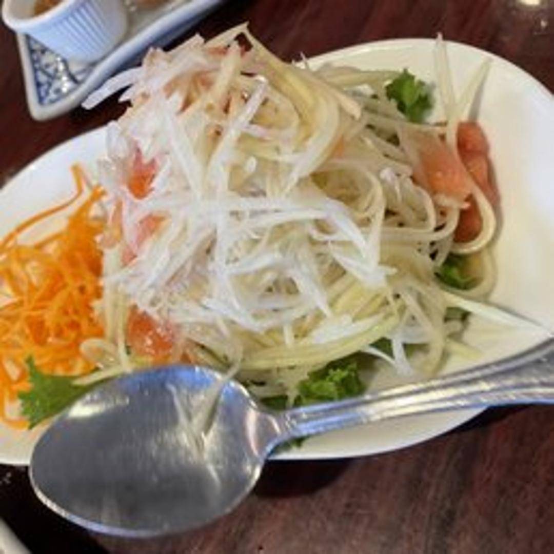 A refreshing and zesty Thai green papaya salad (Som Tum) prepared with shredded green papaya, fresh tomatoes, long beans, peanuts, and chili, all pounded together in a mortar and pestle with a spicy, sour, and savory lime dressing. A vibrant explosion of flavors.