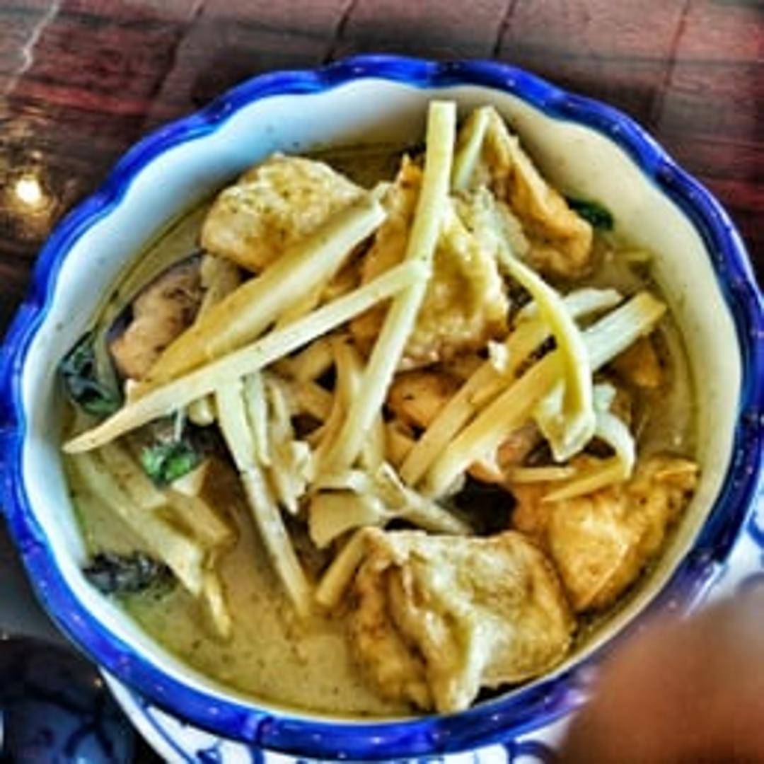 A rich and aromatic Thai green curry featuring a harmonious blend of green chili paste, coconut milk, bamboo shoots, bell peppers, and fresh Thai basil leaves. Simmered to perfection, this creamy and subtly spicy curry offers a depth of flavor that is truly satisfying.