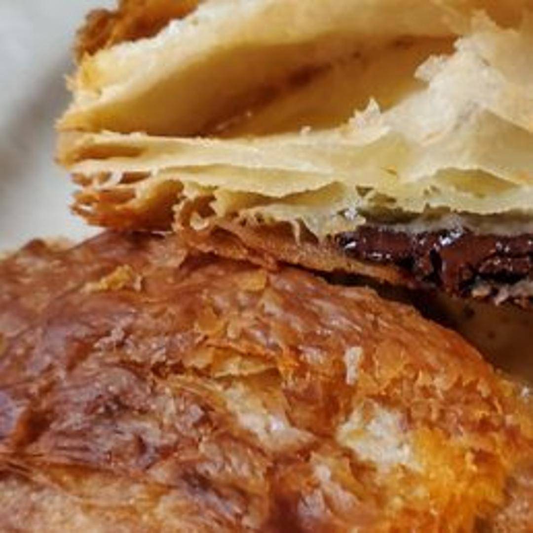 Flaky, buttery croissant filled with rich, dark chocolate. A perfect pairing of textures and flavors for breakfast or a snack.